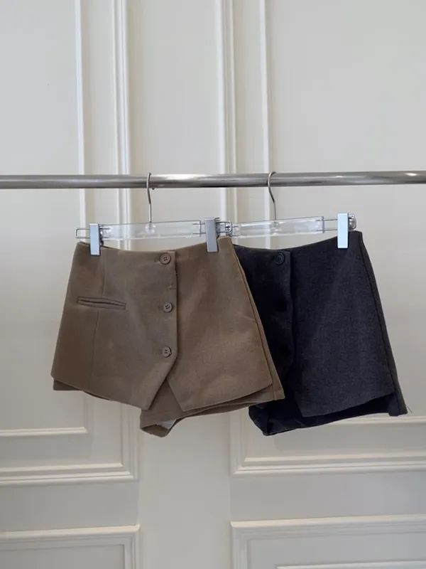 毛呢排釦吊帶兩穿短褲