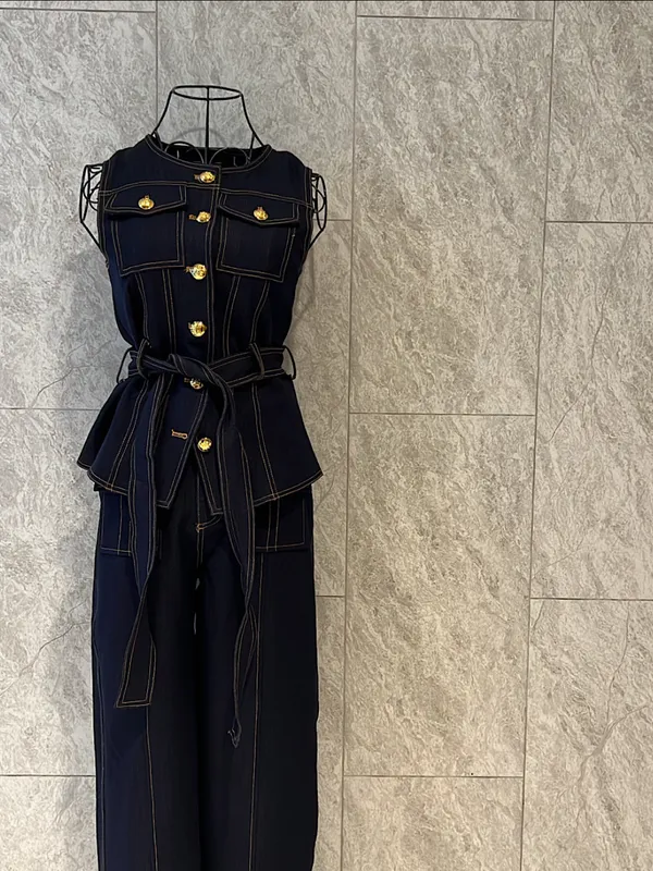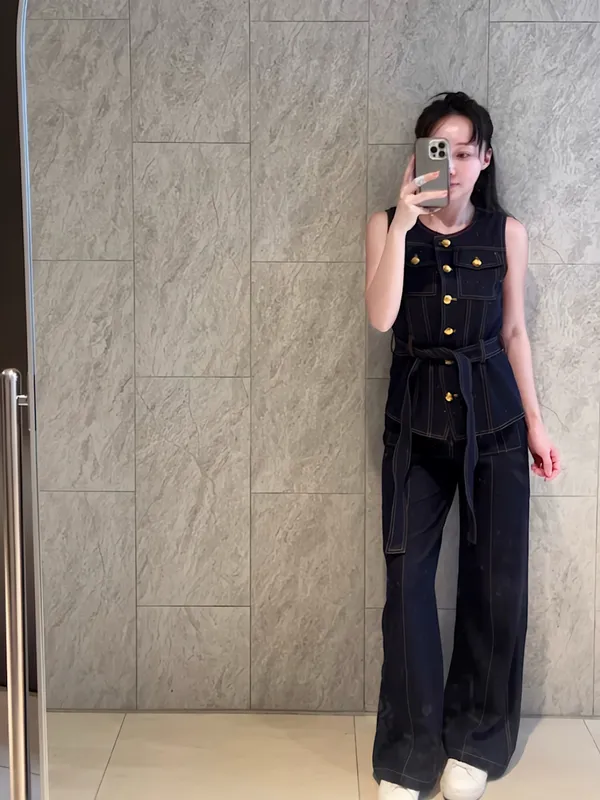 質感金釦車線長褲套裝